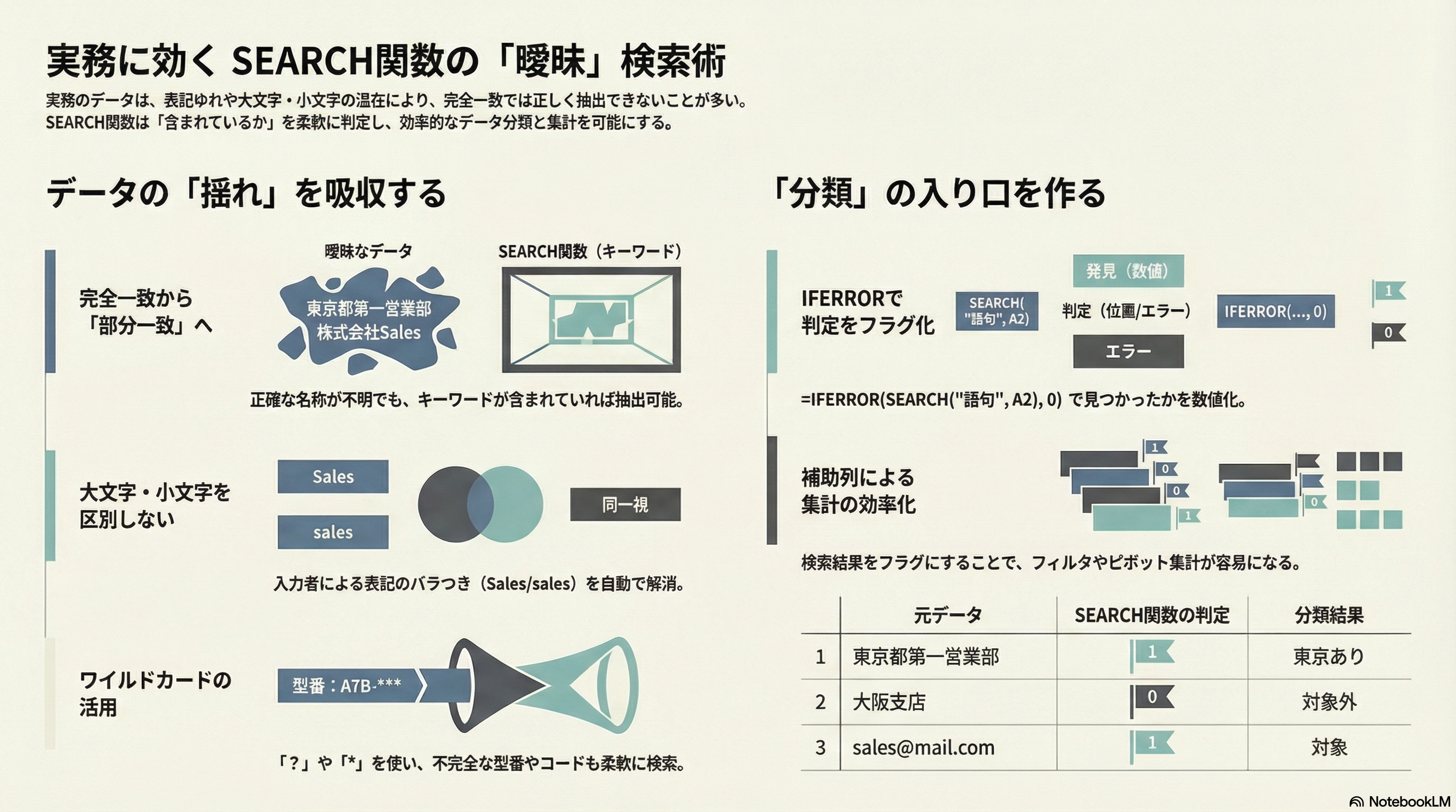 今回の主役は使い分け比較ではありませんが、SEARCH関数が実務で気が利く理由は、 ワイルドカードが使えること と 大文字・小文字を気にしすぎなくてよいこと にあります。